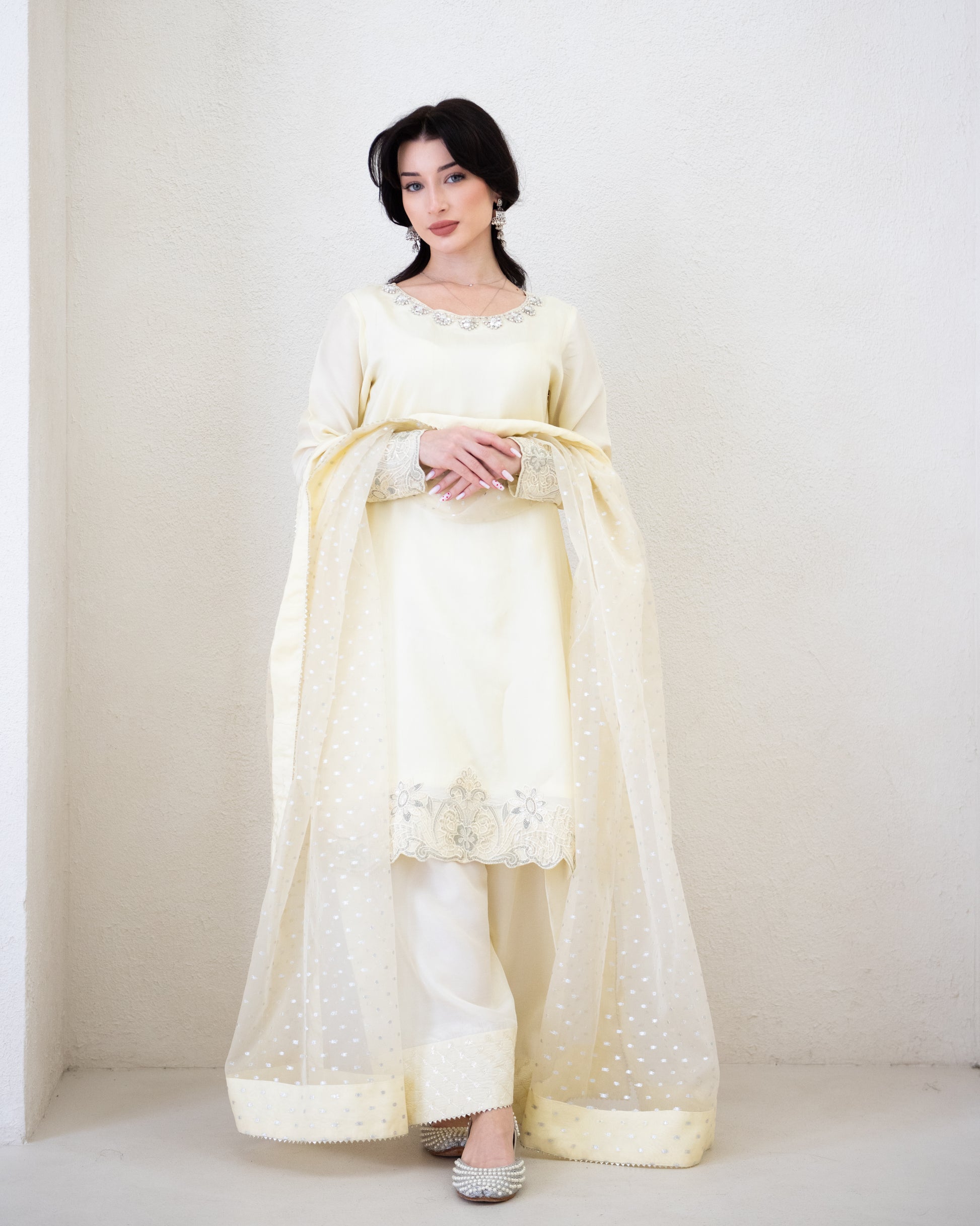 Crafted from luxurious raw silk for both the shirt and shalwar, Ameera has the most intricate embroidery. Effortlessly graceful, endlessly comfortable. To elevate it even further, it is paired with a badla zaari dupatta.