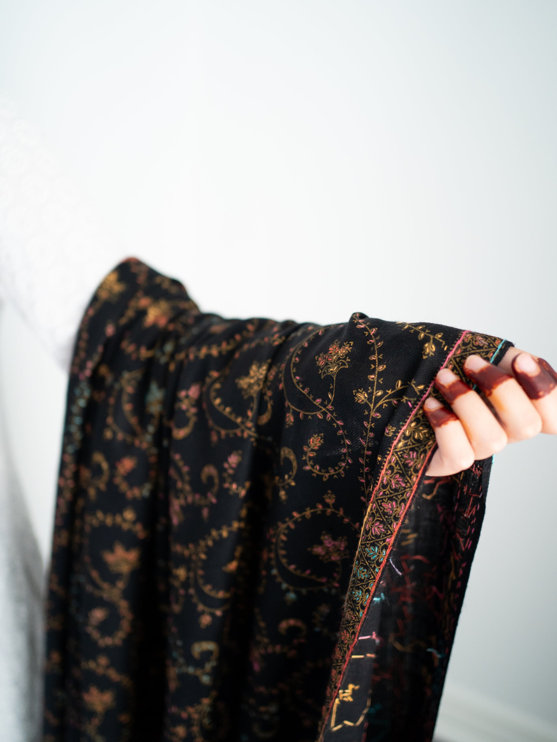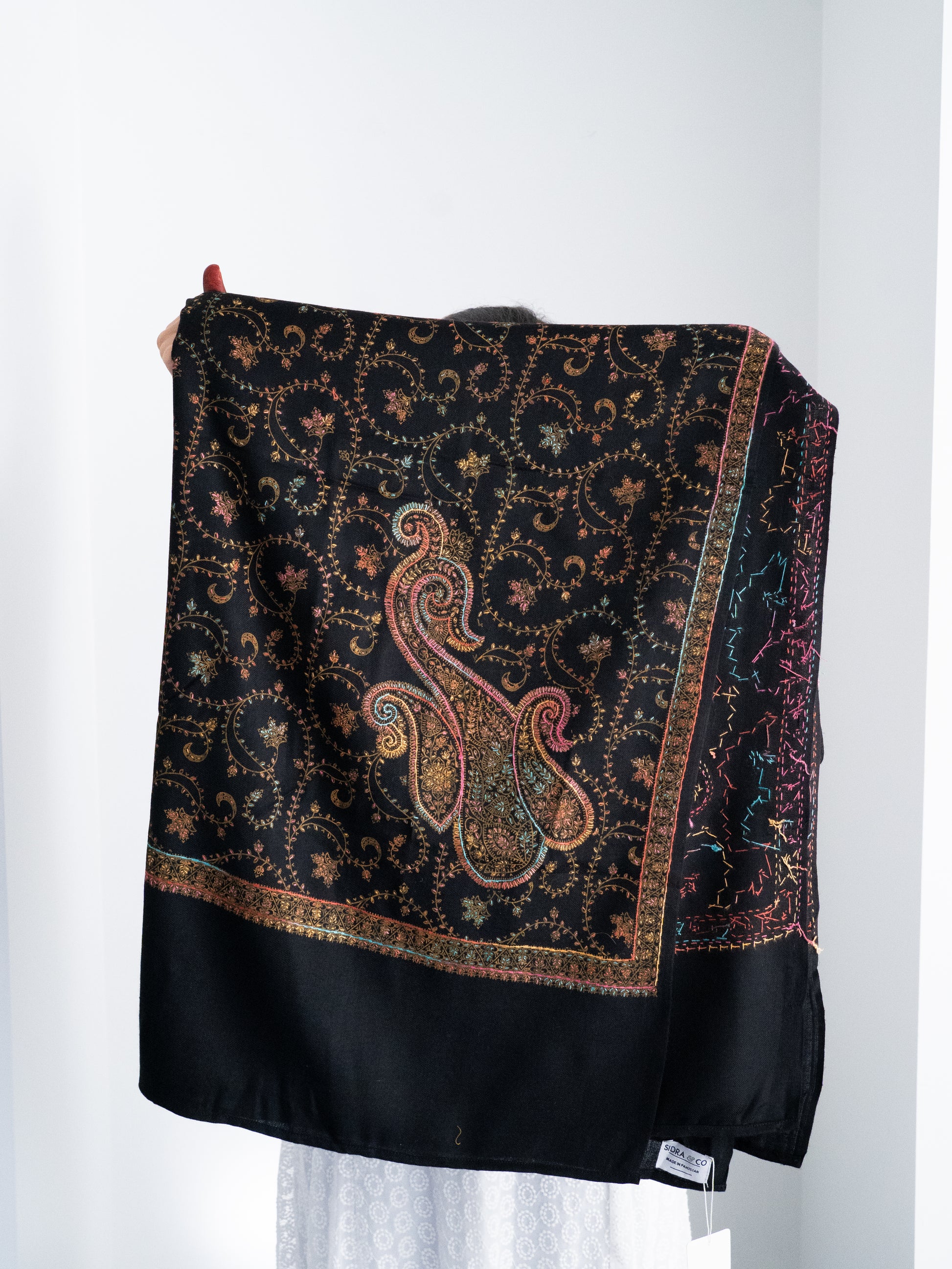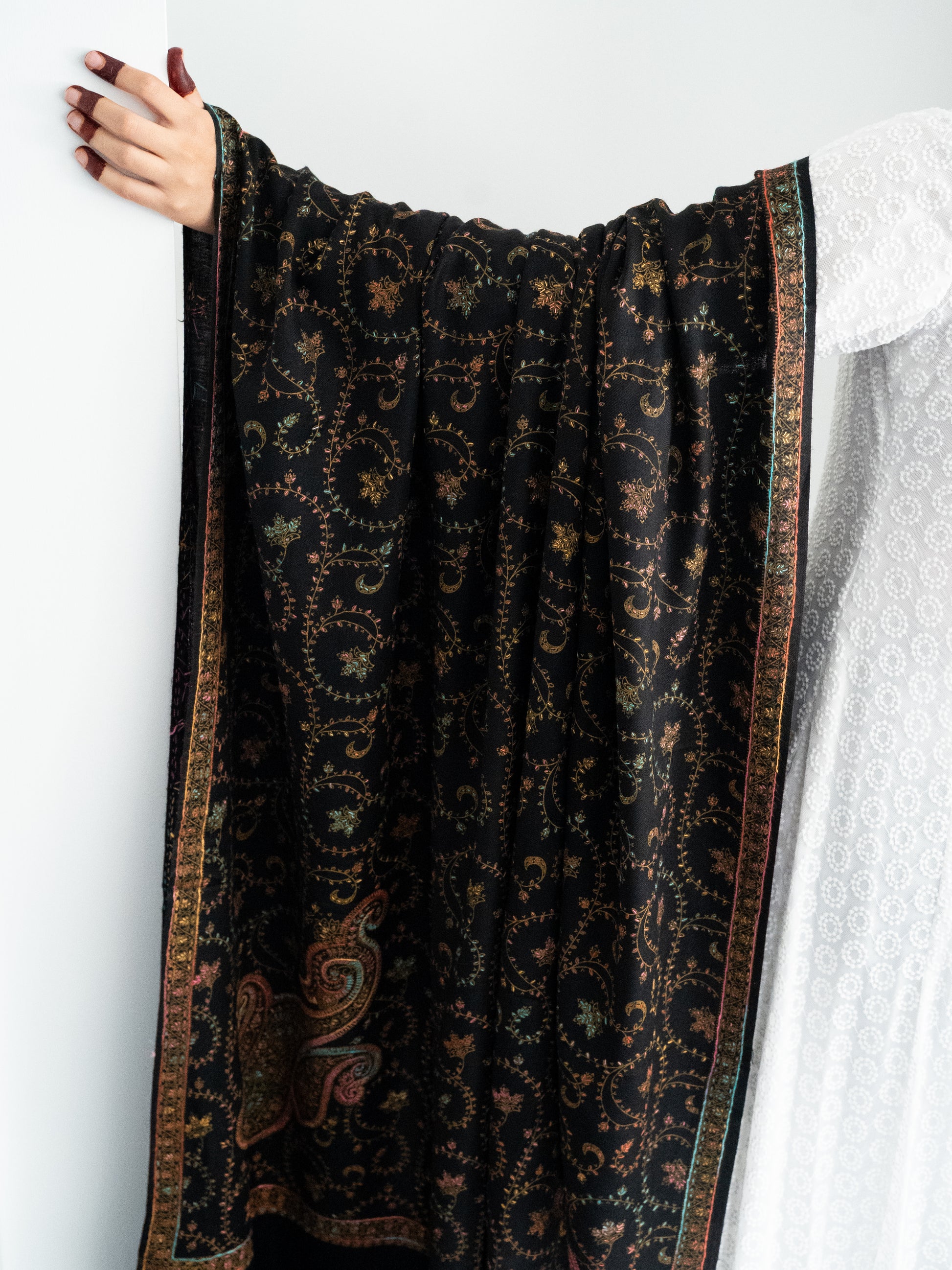 The shawl features exquisite hand embroidery, showcasing intricate patterns and vibrant colors that reflect the region's rich heritage. Lightweight yet luxurious, these shawls are perfect for any occasion, blending traditional artistry with modern style. Wrap yourself in a unique masterpiece of craftsmanship!