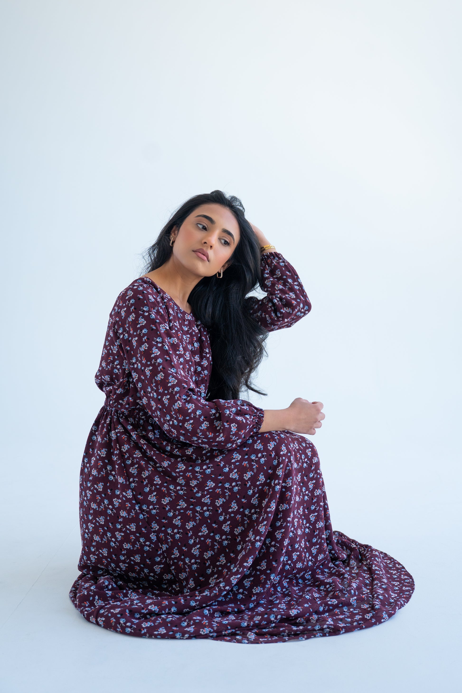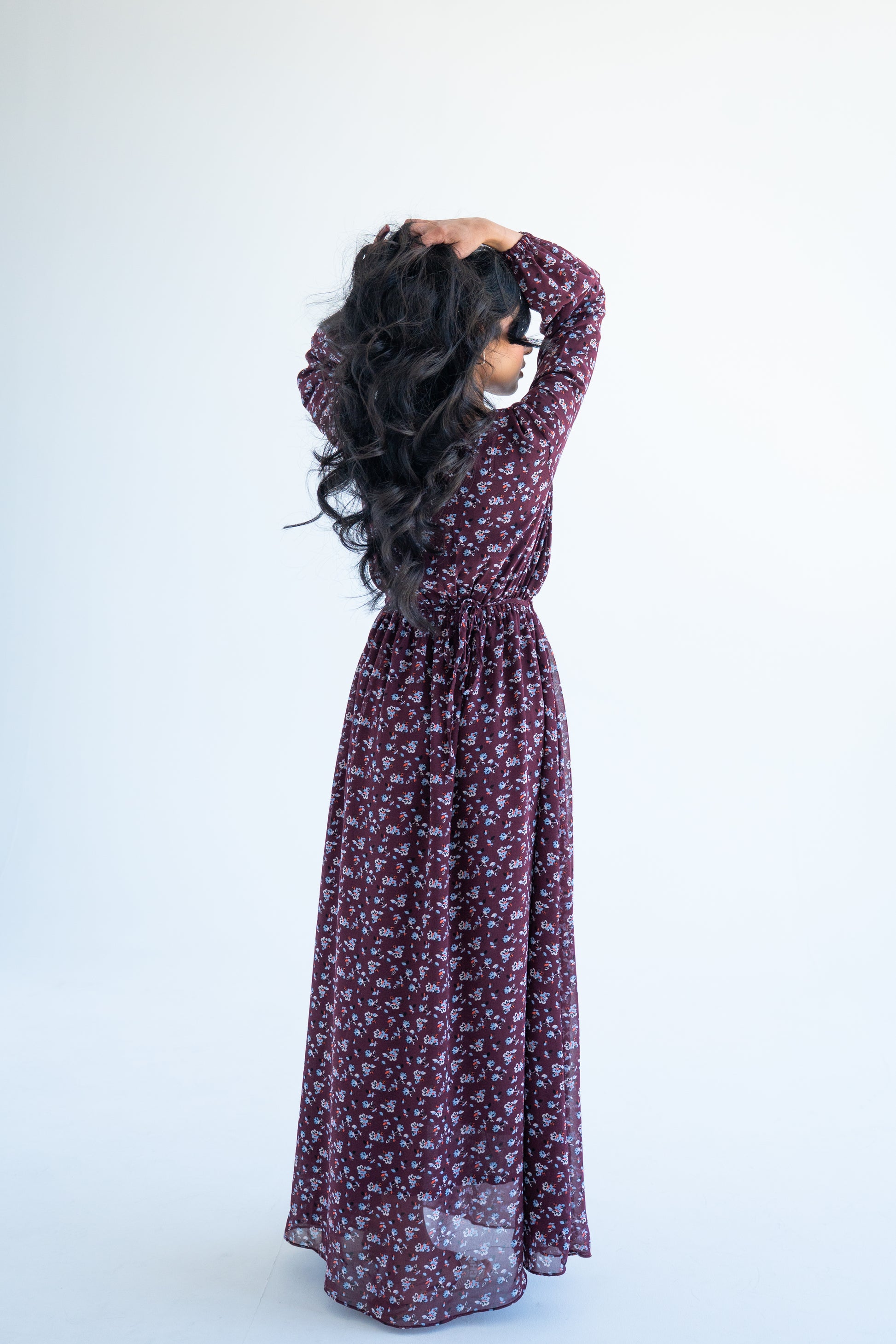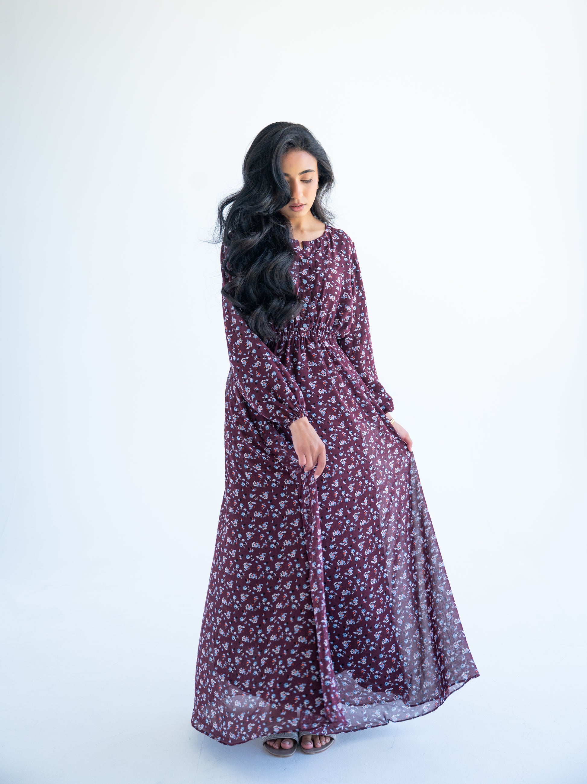 Meet Nazia, a timeless flowy maxi dress crafted from soft, lightweight chiffon. Designed to glide effortlessly with every step, this piece exudes elegance and ease and has an elastic- banded waist. The full-length silhouette offers graceful coverage, while long sleeves with elastic-banded wrists add a delicate, feminine finish.