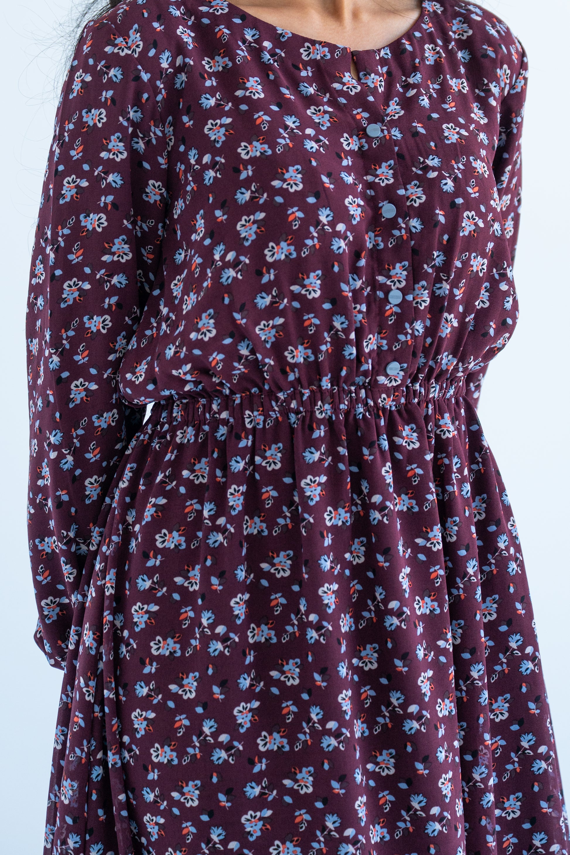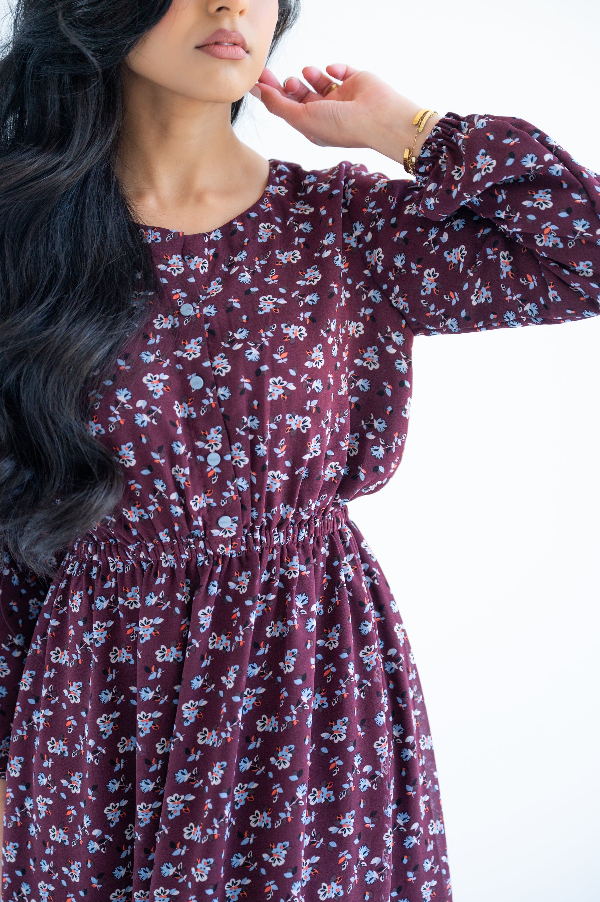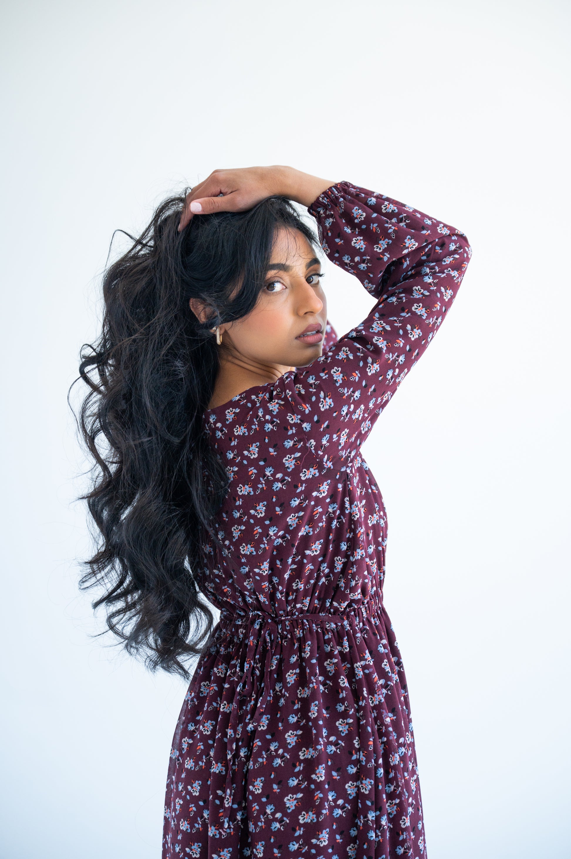 Meet Nazia, a timeless flowy maxi dress crafted from soft, lightweight chiffon. Designed to glide effortlessly with every step, this piece exudes elegance and ease and has an elastic- banded waist. The full-length silhouette offers graceful coverage, while long sleeves with elastic-banded wrists add a delicate, feminine finish.