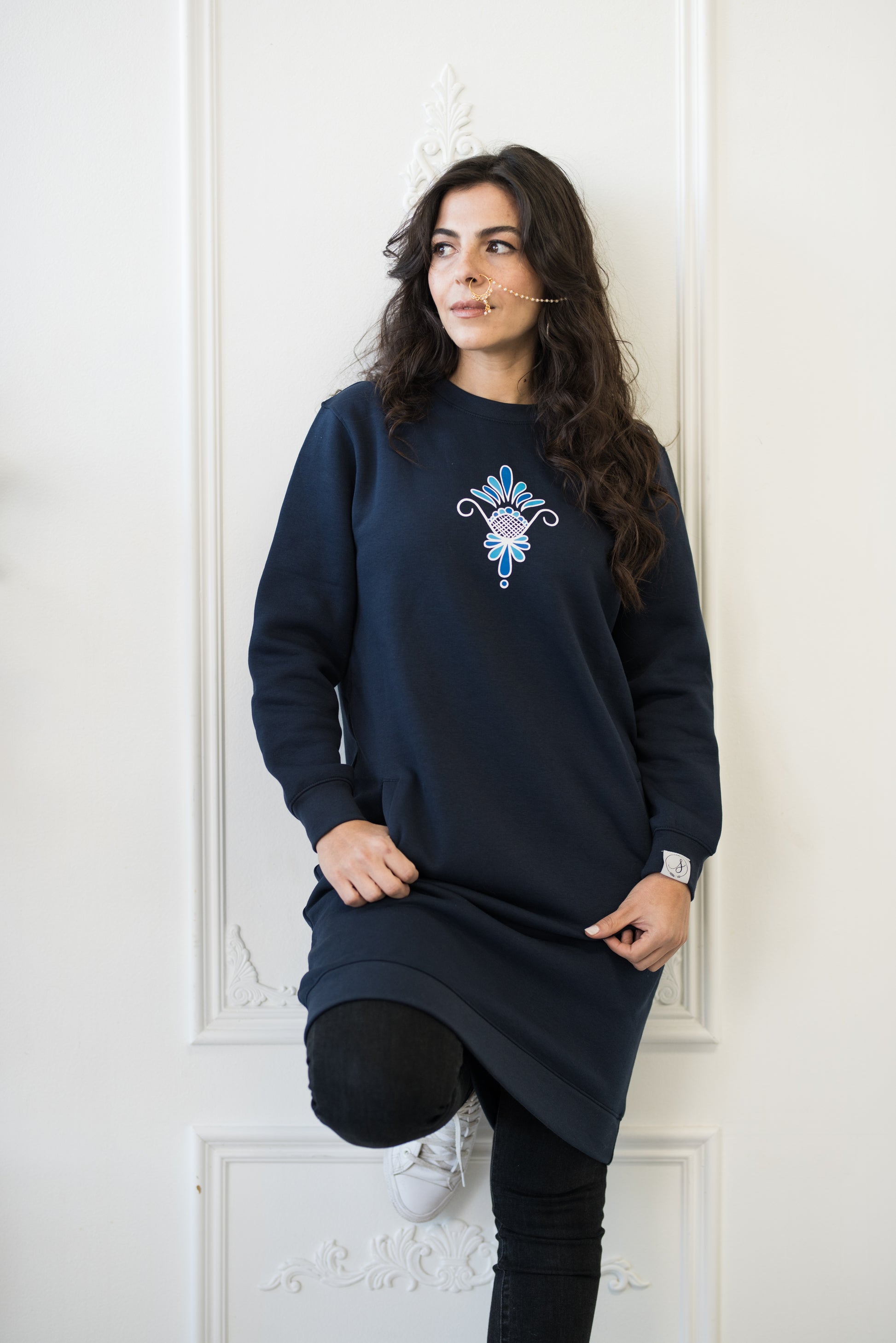 The Baarish Sweater Dress with a screen-printed motif is that perfect balance of comfort and style (and it has pockets!)