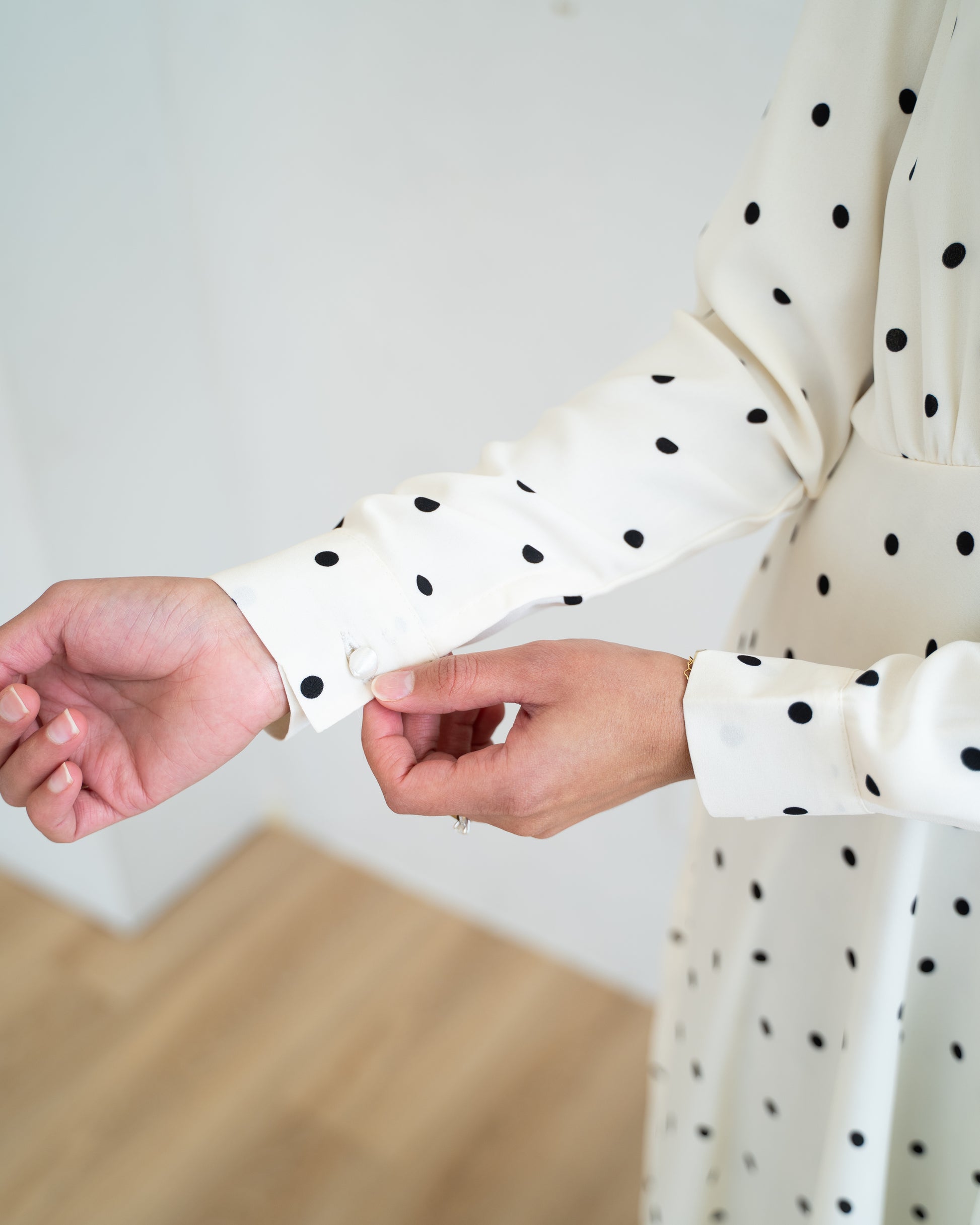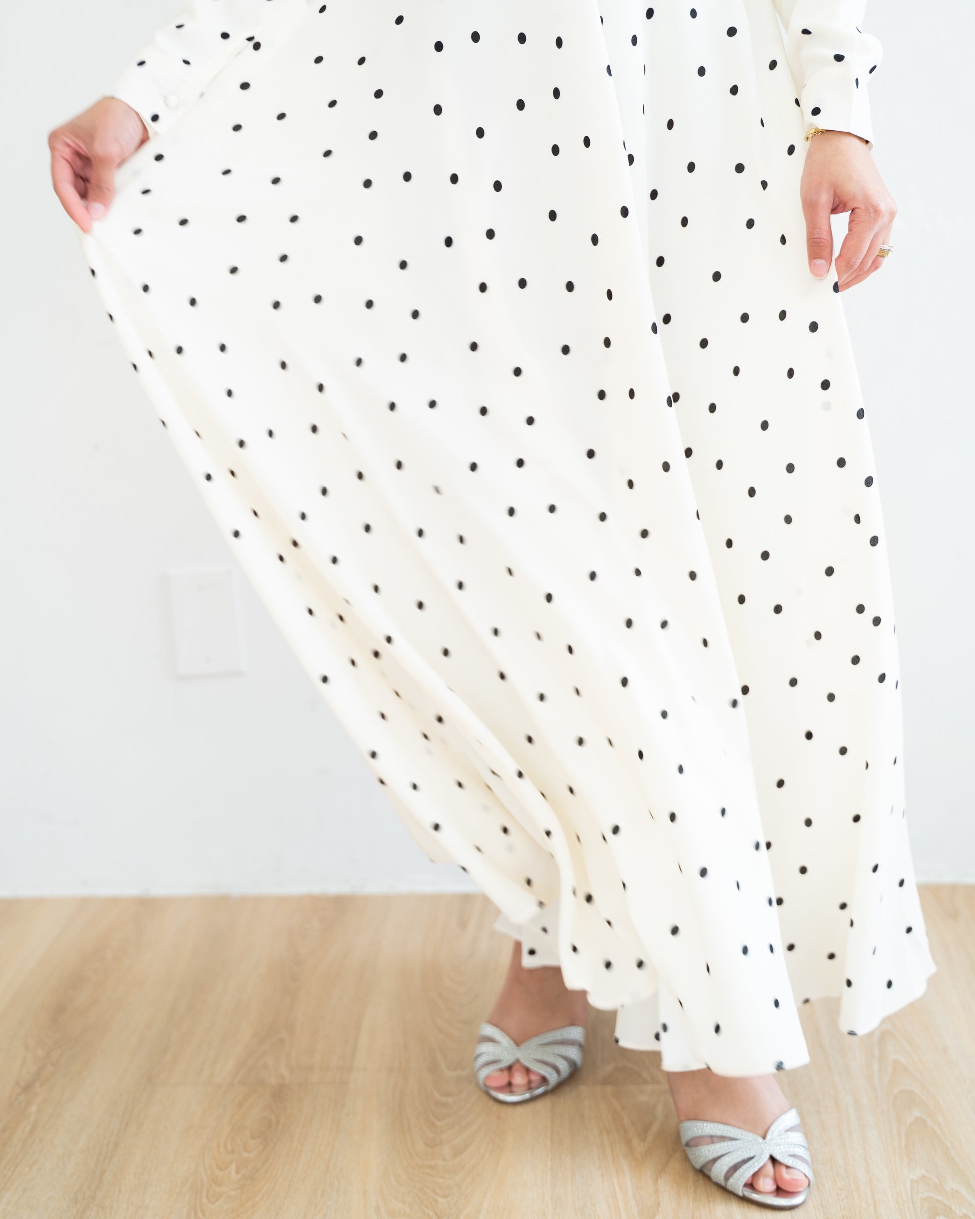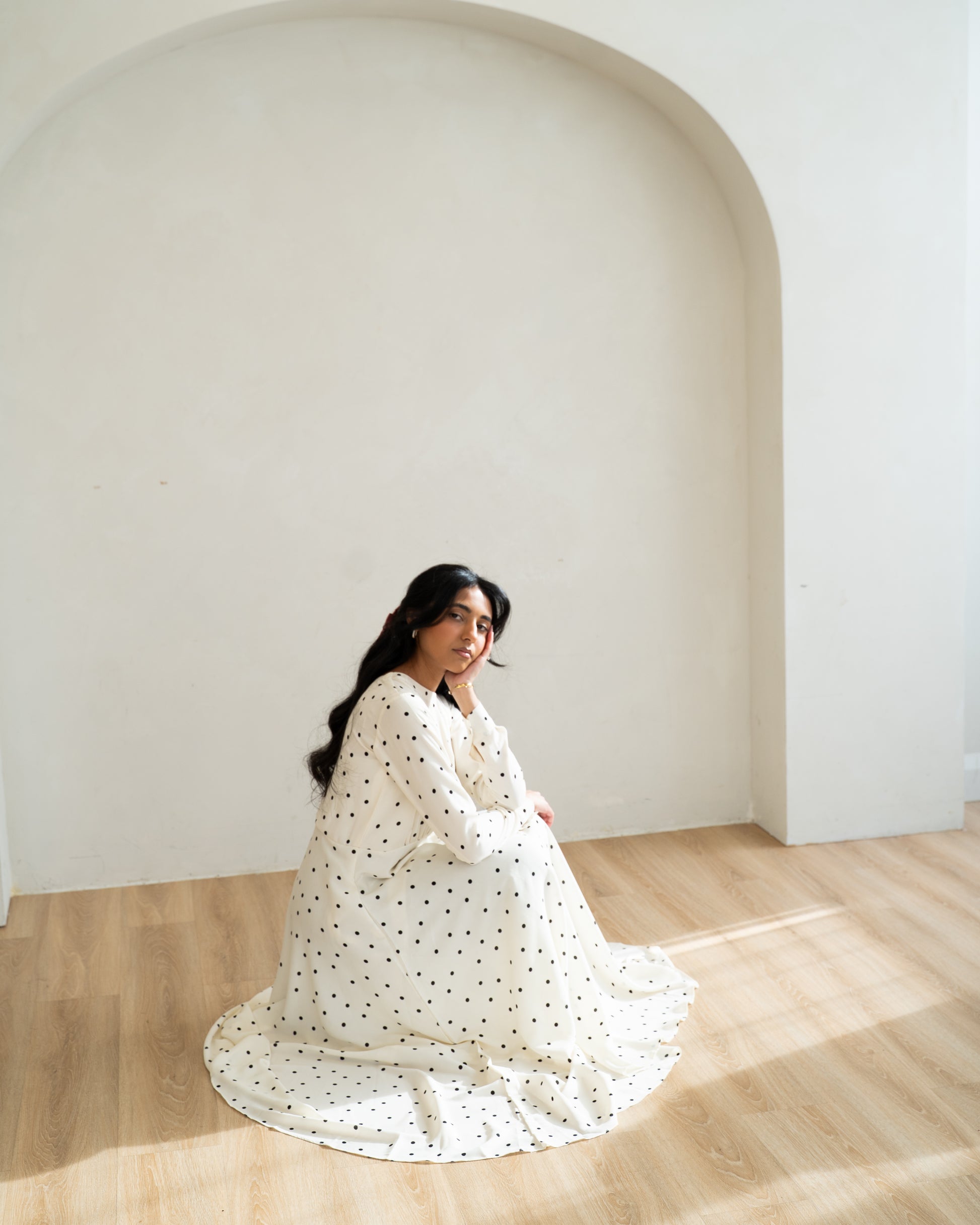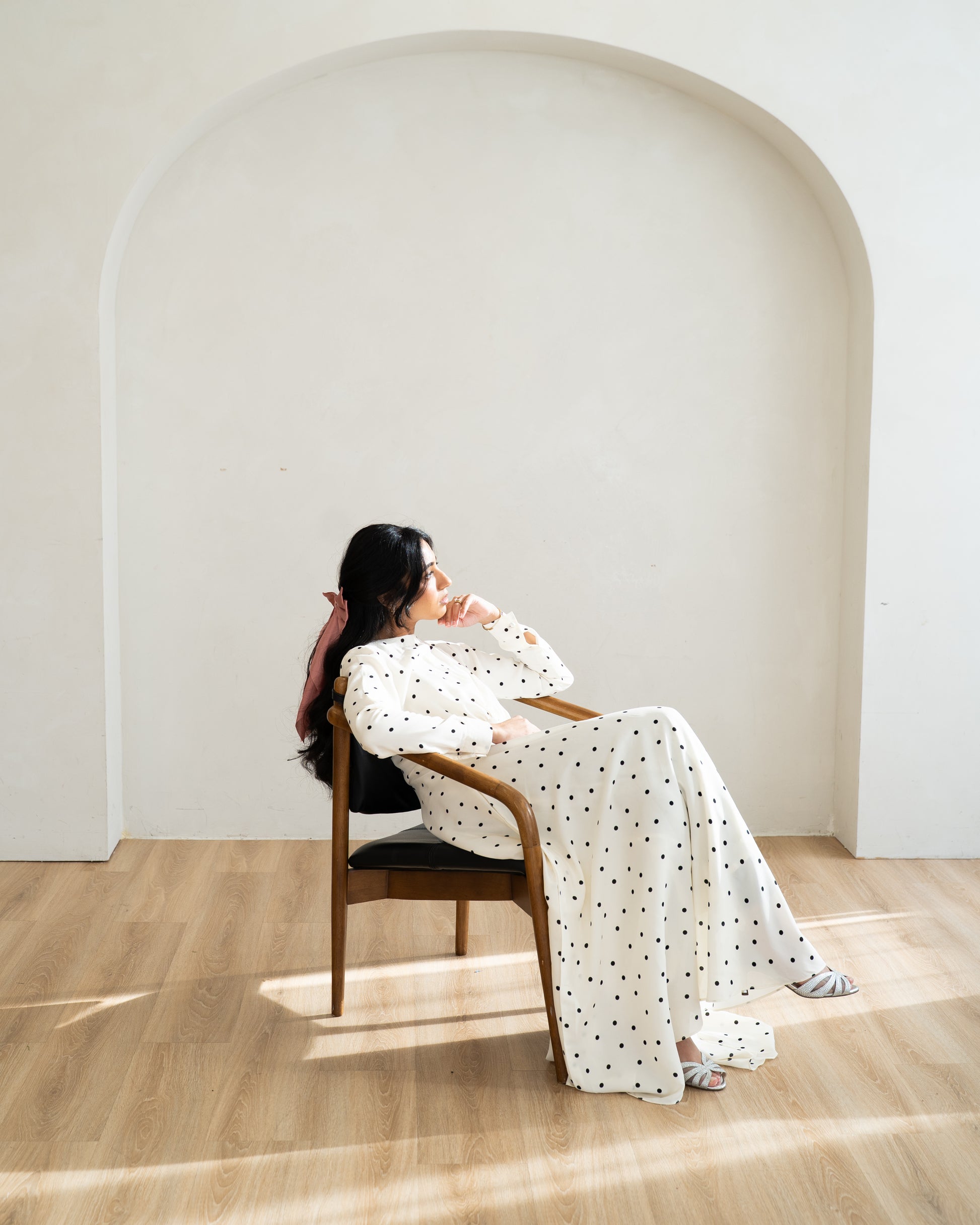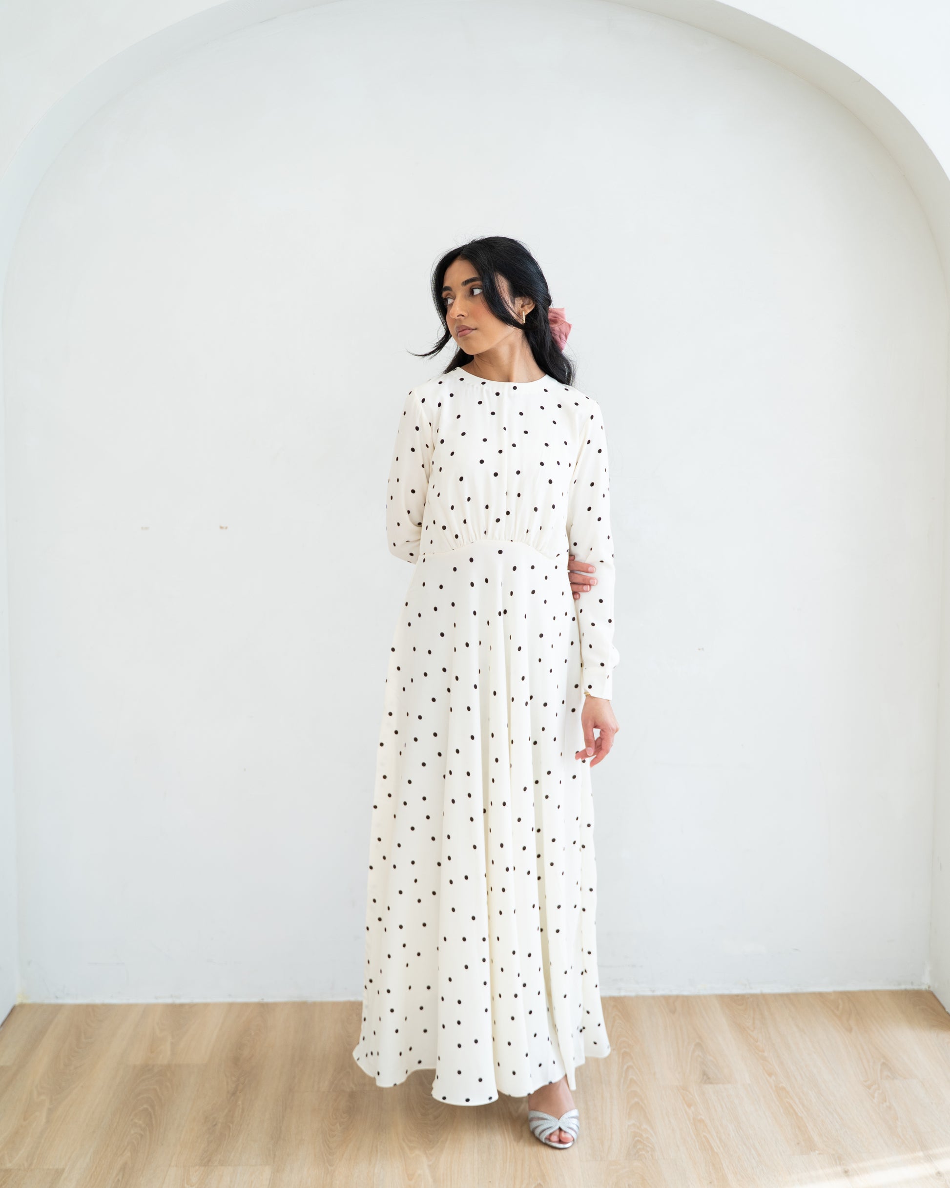 A classic reimagined. The white polka-dot dress embodies understated charm, pairing clean lines with a gentle, graceful flow. It’s simplicity with a spark - modest, modern, and beautifully timeless.