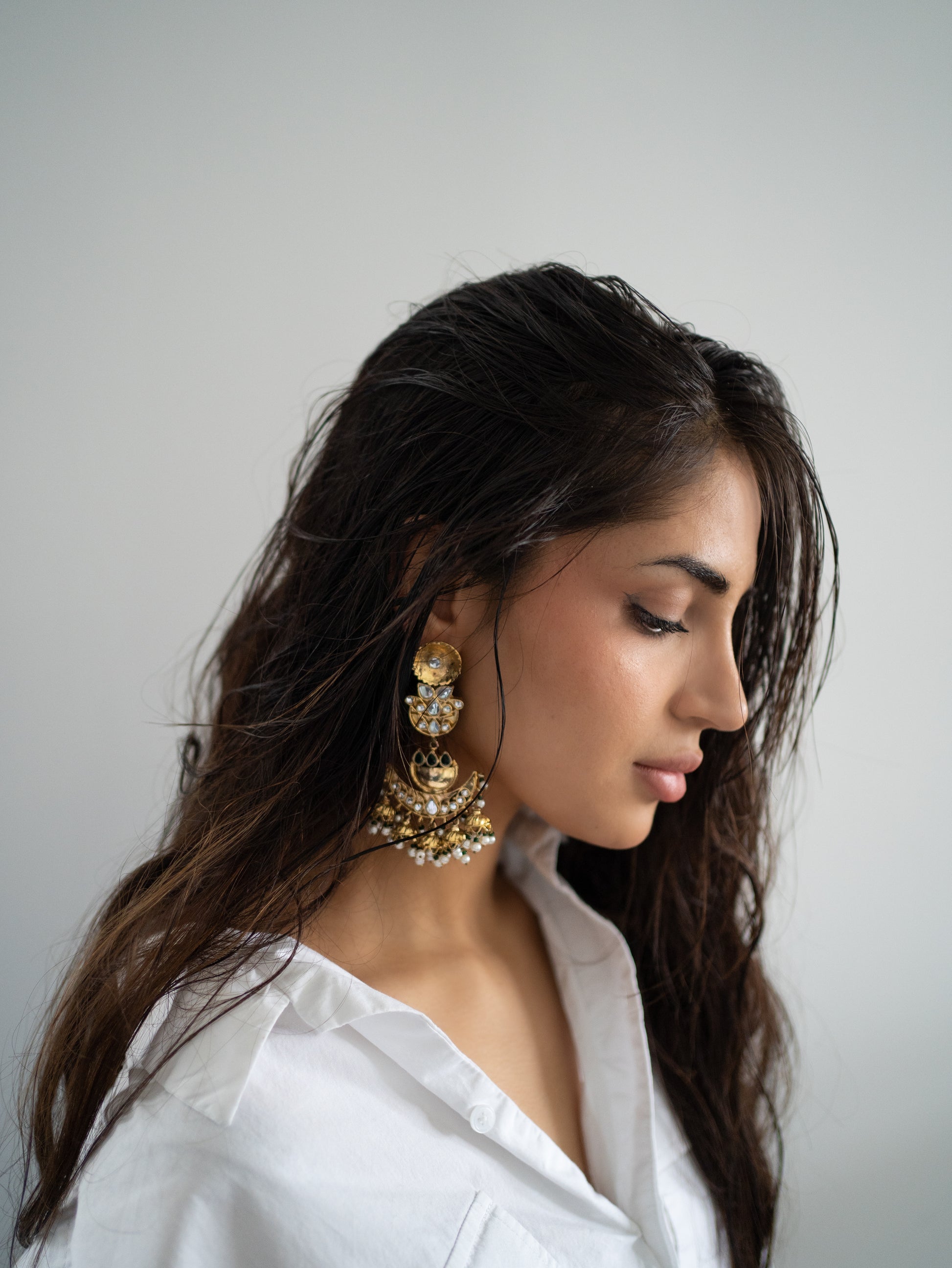 Sahiba earrings will elevate any outfit. They are handmade using brass that is plated in 18K gold by artisans in Pakistan.